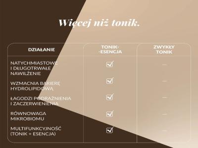 Tonificación eficaz y restablecimiento del equilibrio : la esencia tónica regula el pH adecuado de la piel, reforzando su barrera protectora natural y preparándola para las siguientes etapas del cuidado.